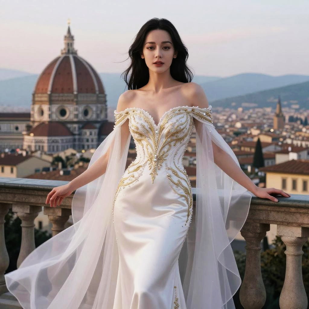 A digital artwork featuring a beautiful woman with long, flowing black hair standing on a balcony. She wears an elegant, off-shoulder, gold-embroidered beige dress with long sleeves. Behind her is a fantasy cityscape with grand domed buildings and mountains under a glowing sky with moons. Her dress billows slightly, and she looks confident and serene. The overall style is fantasy with a romantic, ethereal vibe.