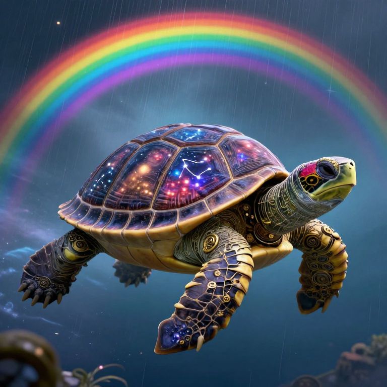 A colossal clockwork turtle swims slowly through a sky filled with swirling rainbows, its shell inscribed with constellations that shift and whisper secrets of a forgotten cosmos.