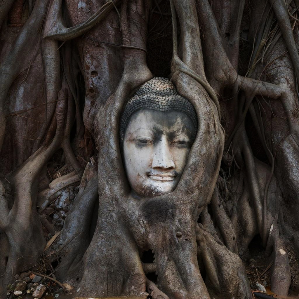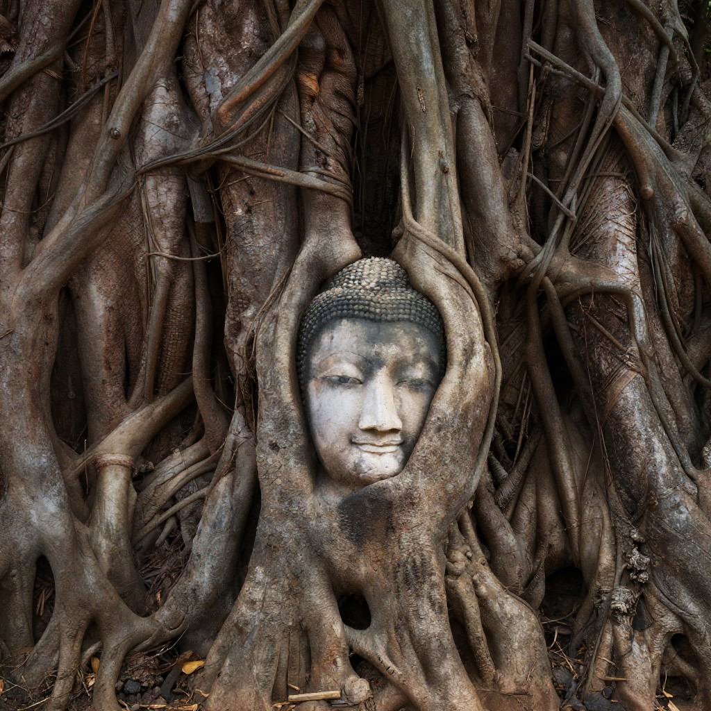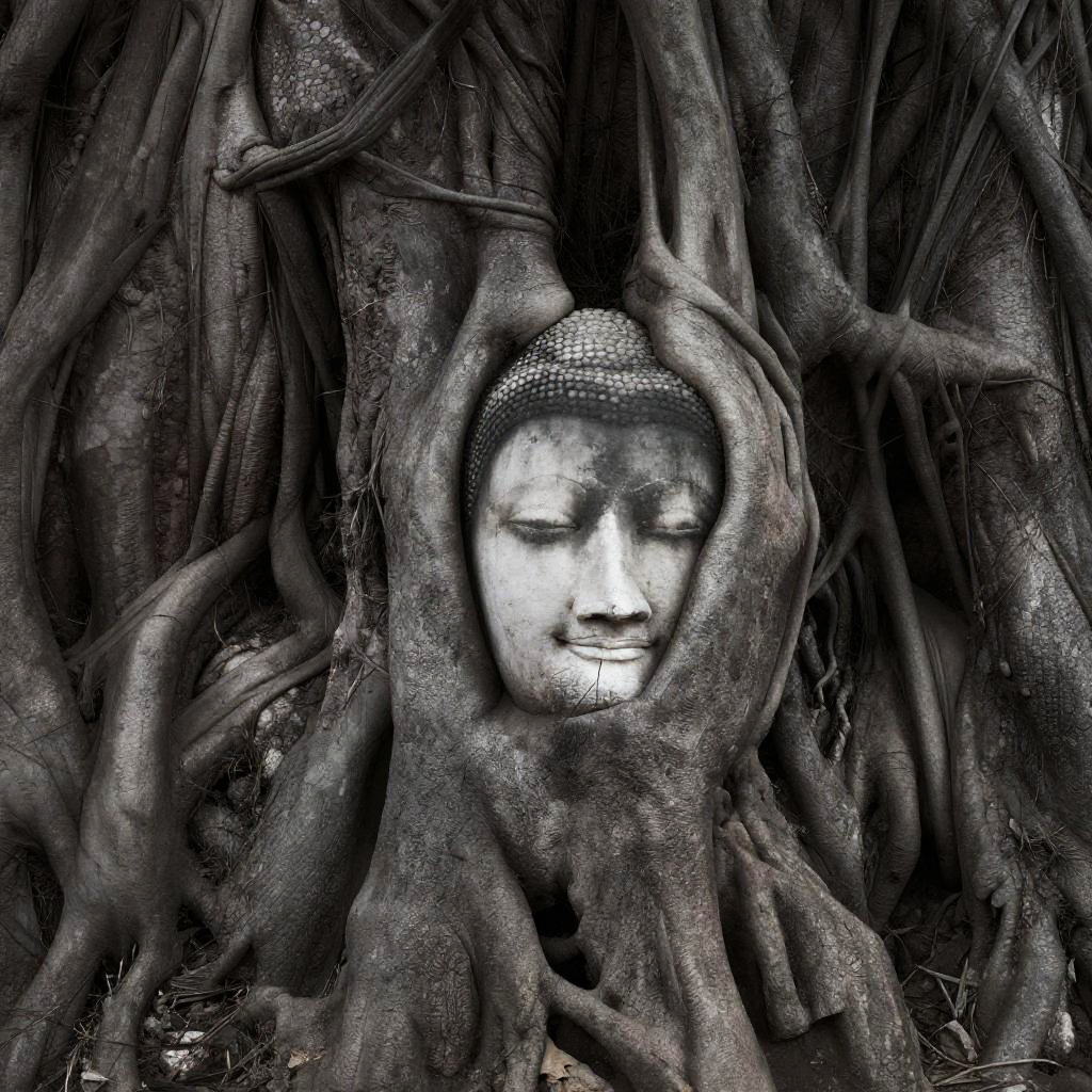 Photograph of a serene Buddha face carved into the trunk of an ancient, gnarly tree with tangled roots. The tree's bark is rough and weathered, with deep brown and gray tones. The Buddha's calm eyes and subtle smile are centered in the tree's trunk, surrounded by an intricate network of roots that create a natural frame. The image has a slightly desaturated, high-contrast look.