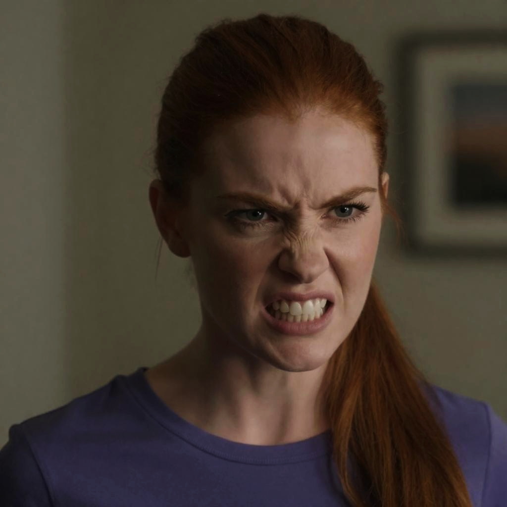 Close-up photograph of a woman with red hair in a ponytail, face contorted in a fierce, angry expression with bared teeth. She wears a purple shirt, indoors with dim lighting and blurred background.