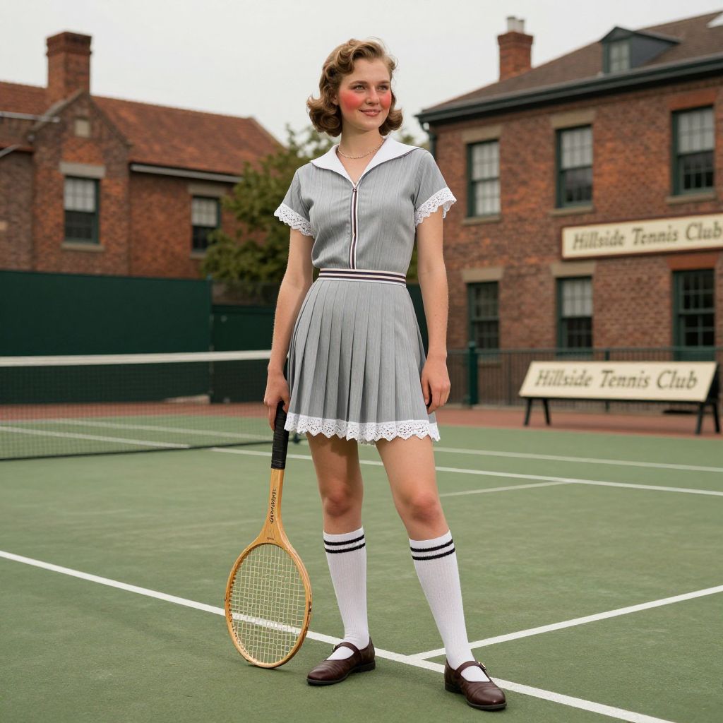 Photorealistic image of a 1930s-style tennis girl, mid-20s, with rosy cheeks, high cheekbones, and a warm smile, wearing a sporty pleated skirt costume with a white lace trim, knee-high socks, and flat leather shoes, holding a tennis racket, standing at the edge of a lush green tennis court surrounded by old-style brick buildings and a vintage sign reading 'Hillside Tennis Club', authentic 1930s fashion details and natural lighting.