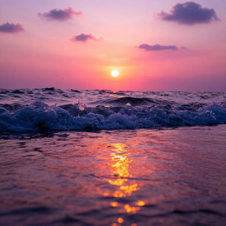 Photograph of a vibrant sunset over a calm ocean, with pink and purple hues in the sky, and orange reflections on the water, waves gently crashing