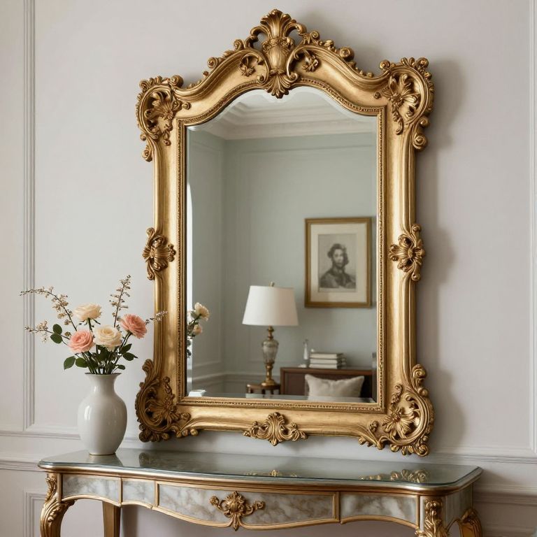 A luxurious Victorian-style interior featuring an ornate gold-framed mirror mounted on a light gray wall. Below the mirror is a matching decorative console table with a reflective surface and intricate gold detailing. A white vase with soft pink and cream roses and greenery is placed on the console, adding a touch of elegance. The reflection in the mirror shows a classic lamp, framed artwork, and subtle molding on the room's walls, emphasizing the chic and timeless Victorian decor.