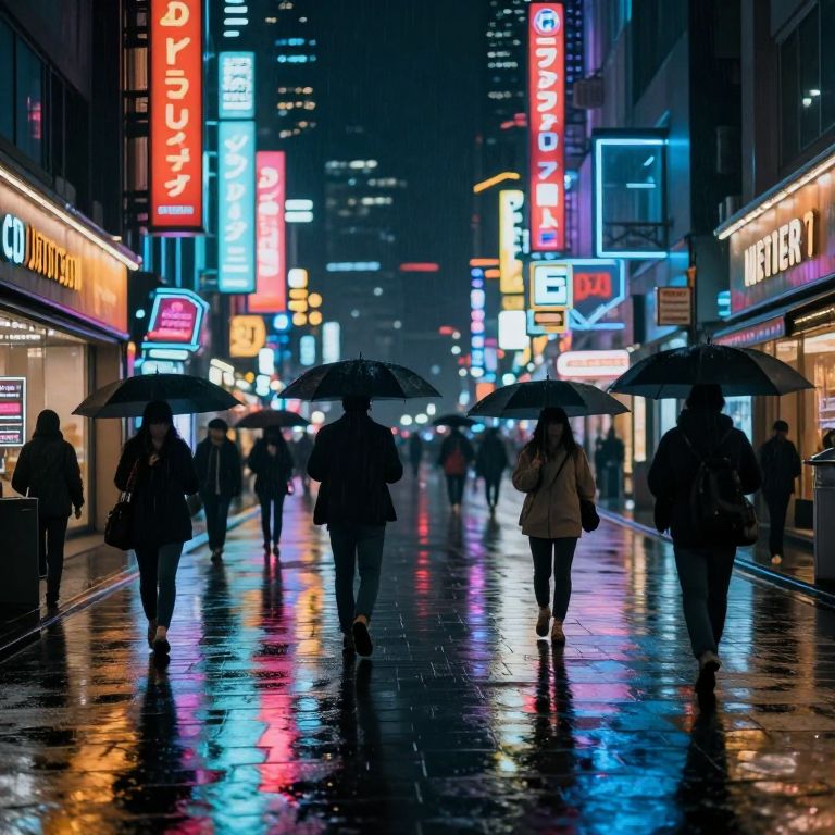 Photograph of a vibrant, rainy urban night scene in a city. Silhouetted figures, mostly dressed in dark coats and holding umbrellas, walk along a wet, reflective street. Bright neon signs in red, blue, and white illuminate the background, advertising various businesses. The street is lined with tall buildings on both sides, and the distant cityscape is blurred by the rain. The scene captures a blend of motion and stillness, with the colorful neon lights contrasting against the dark, rainy atmosphere. The overall mood is both bustling and serene.