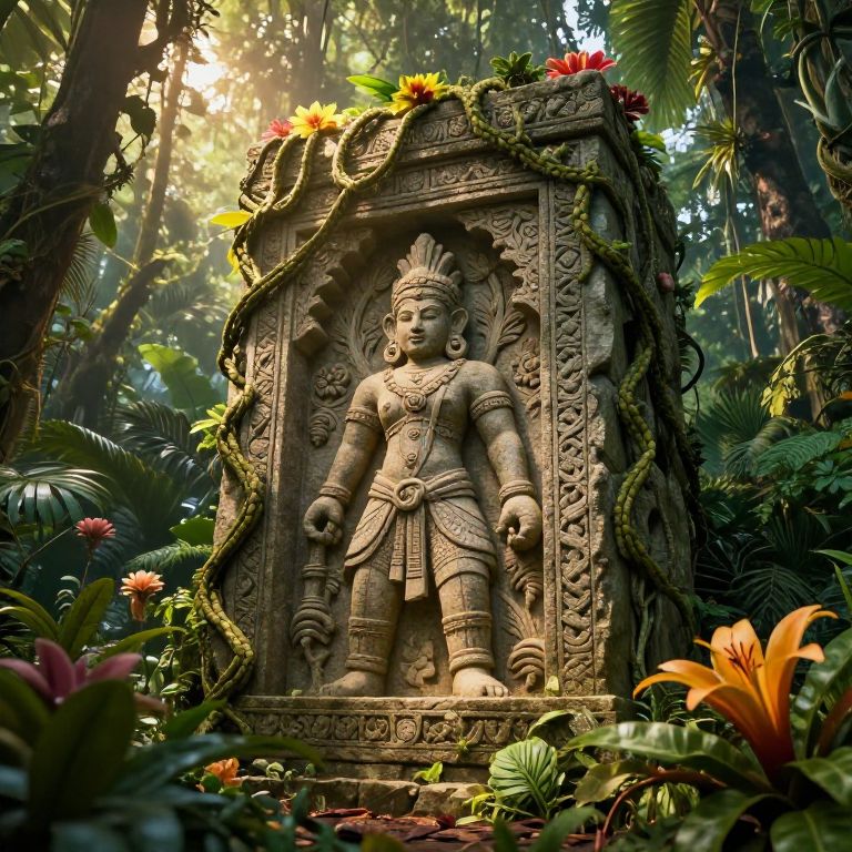 Photograph of an intricately carved stone statue of an ancient deity with a detailed headdress, wearing a traditional, ornate outfit with arm and leg bands, standing in a lush, sun-dappled jungle. The statue is encased in a carved pedestal adorned with vines and colorful flowers. Surrounding the pedestal are vibrant tropical plants, including large green leaves and orange flowers. Sunlight filters through the dense forest canopy, casting a warm, mystical glow on the statue and its surroundings. The image has a highly detailed, almost surreal quality, with rich textures and vivid colors.