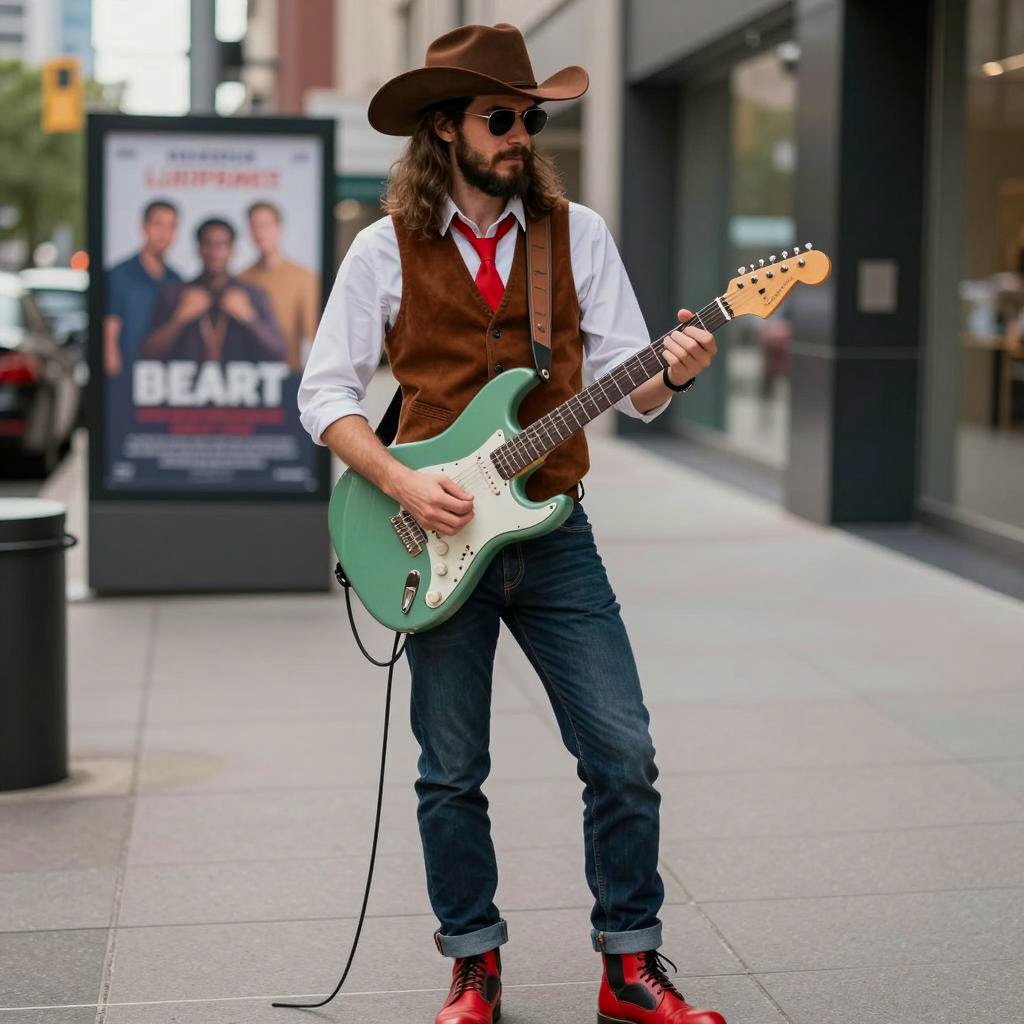 Three male musicians in a dimly lit stage. Foreground: dark-haired man with sunglasses, black shirt, playing a brown electric guitar, intense gaze. Background: light-haired man in blue shirt, playing an acoustic guitar. Drum set partially visible. Curtain backdrop.