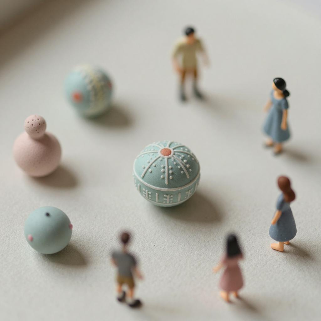 Photograph of a miniature scene featuring six small, figurine-like characters and three pastel-colored spheres on a white, textured surface. The central figure is a blue, dome-shaped object with white lines and a pink circle. The characters, slightly blurred, include a man in yellow and beige, a woman in a blue dress, and others in various colors and styles. The pastel spheres, one pink and two blue, are scattered around. The lighting is soft, creating gentle shadows. The overall composition is whimsical and delicate, with a shallow depth of field adding a dreamlike quality.