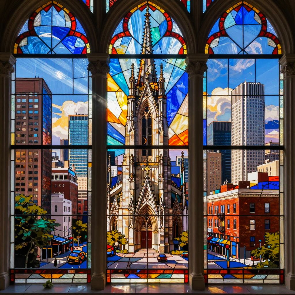 Photo to stained glass generator visualization, converting urban cityscape photos into colorful stained glass window patterns, geometric panes, radiant light shining through, dynamic composition, rich color palette, classic cathedral window inspiration