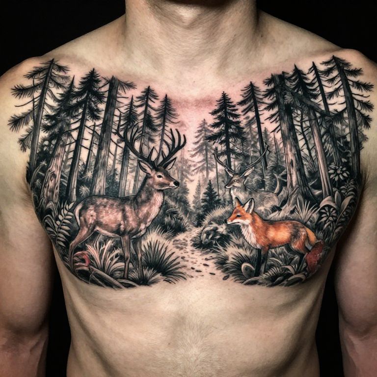 Forest chest tattoo with a mystical woodland scene including deer, foxes, and tall pine trees, intricate line work and naturalistic shading, wrapping around the chest and collarbone