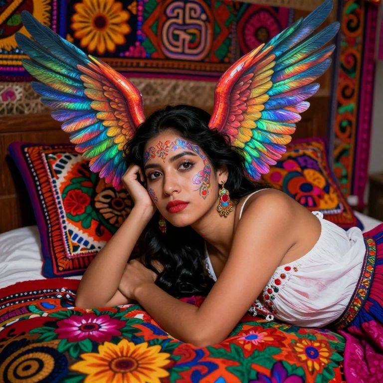 Photograph of a young woman with long black hair, wearing a colorful flower crown, butterfly wings, and elaborate traditional jewelry. She is dressed in a blue off-shoulder dress adorned with intricate beadwork and turquoise stones. Her hands are clasped near her mouth, conveying a surprised or shy expression. Her butterfly wings are vibrant with orange, yellow, and black patterns. The background is a lush, green forest, adding a natural, magical ambiance to the scene. The woman's skin tone is a warm brown, and her expression is gentle and expressive. The overall style combines elements of fantasy and traditional culture.