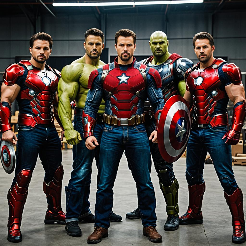 Bradley avengers,muscular, 6+boys, weapon, power armor, male focus, pants, facial hair, armor, alien, shield, glowing, realistic, green skin, multiple boys, superhero, red shirt, jeans, denim, axe, red armor, black hair
