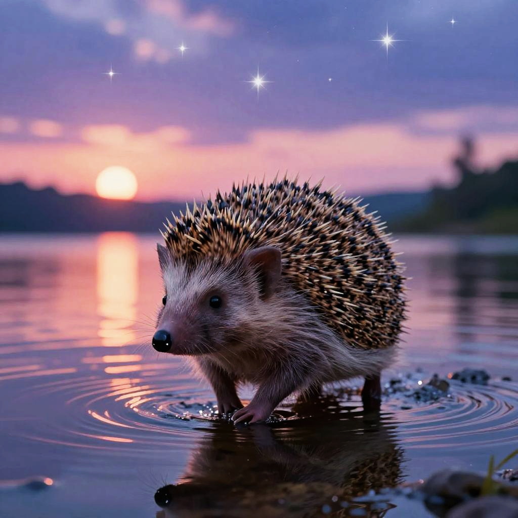 Spiny mammal family in a snowy forest clearing, soft ambient light, quills frosted with snowflakes, painterly style with naturalistic detail, serene and peaceful mood