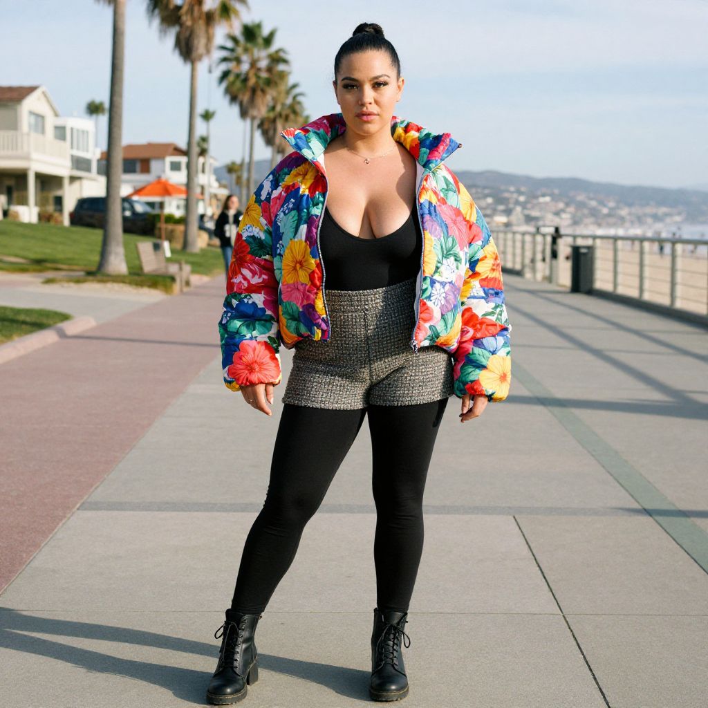 Photograph of a curvy woman with olive skin, dark hair, wearing a white checkered crop top, pink high-waisted pants, white