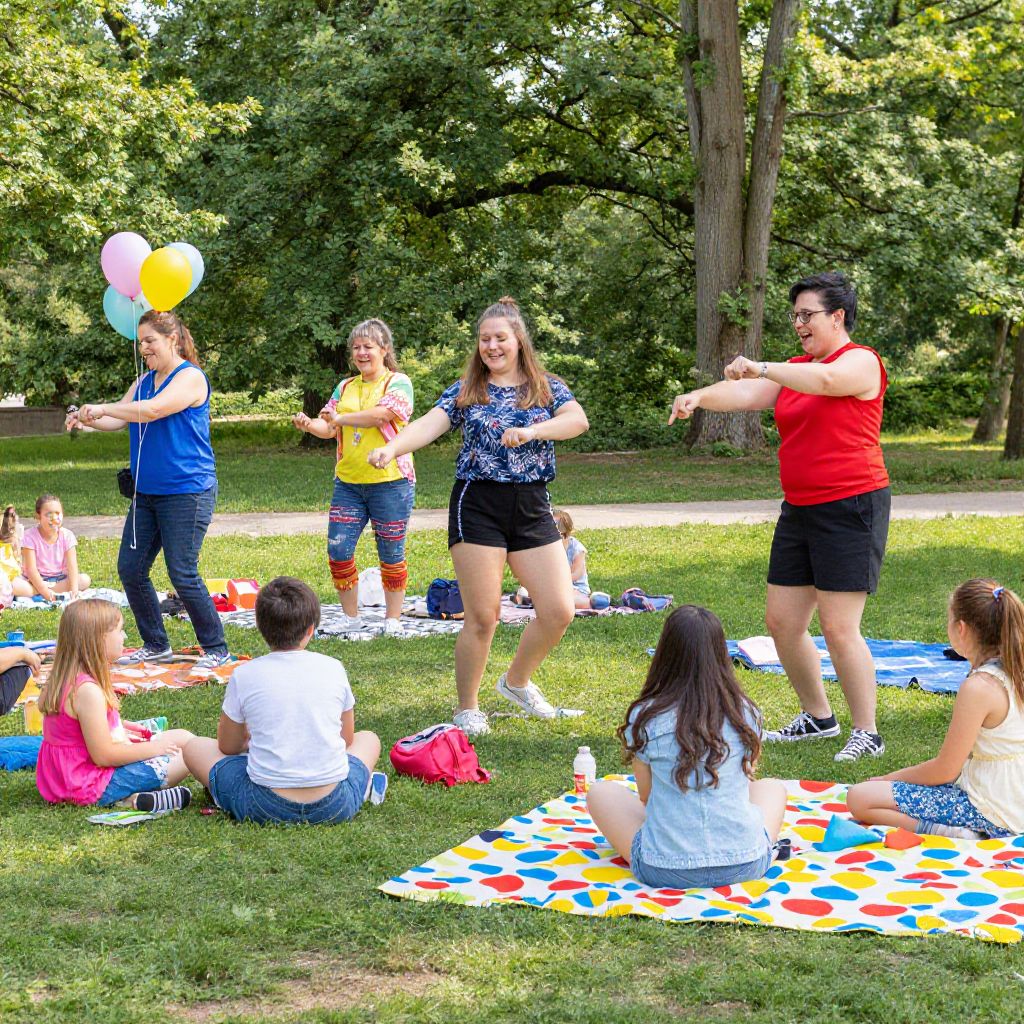 Inmigrantes families reunited at an urban park, children playing and adults sharing stories, multicultural ambiance with colorful clothes and flags, soft golden hour lighting, painterly texture, emotive faces conveying resilience and joy