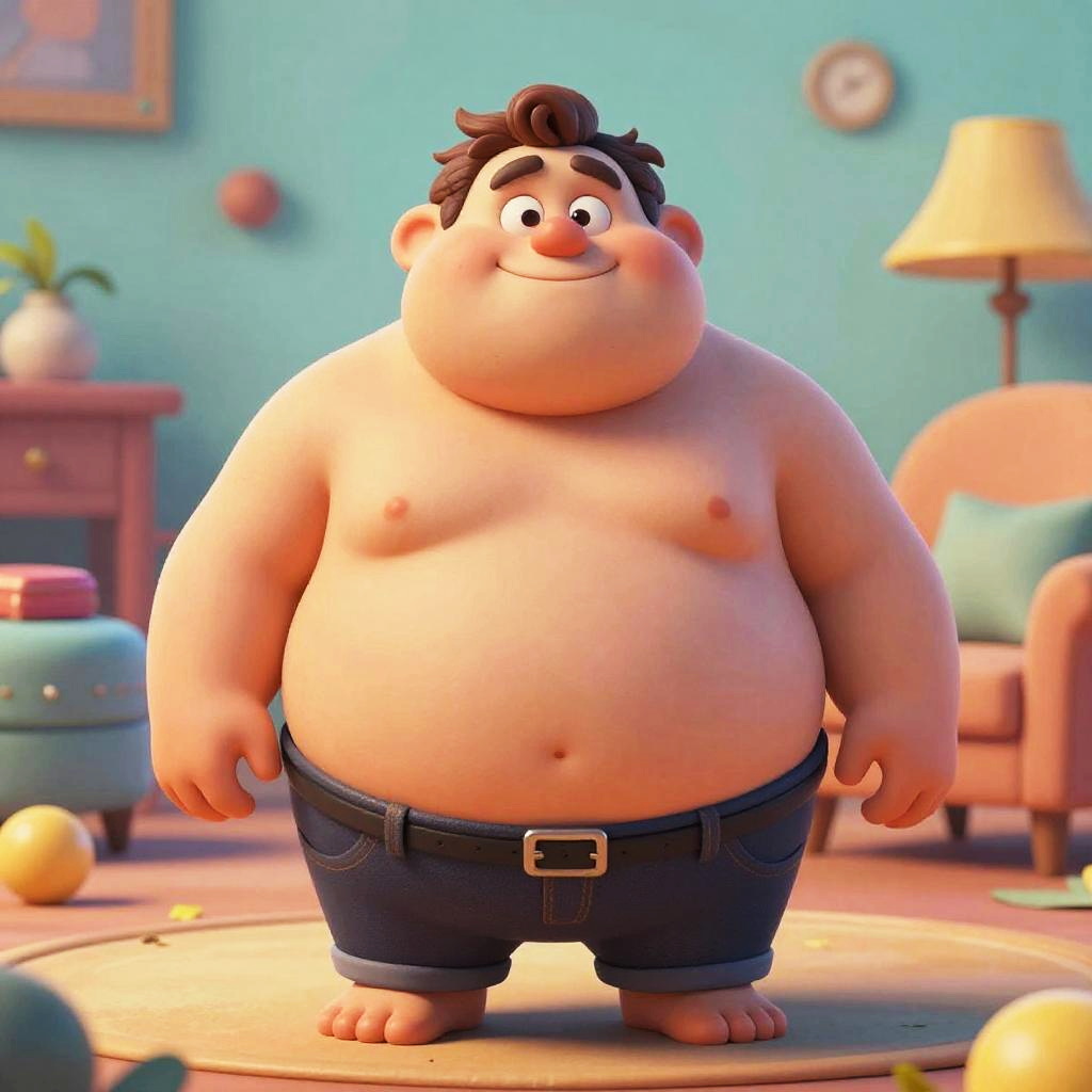 Morbidly obese albert depicted as a surreal cartoon character, exaggerated weight and round shapes, vibrant colors, soft lighting, whimsical background with oversized furniture, a friendly smile, digital art style