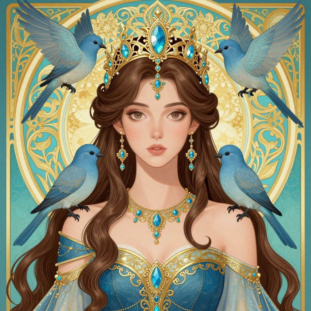 A highly detailed digital painting of a radiant sun goddess with piercing eyes, adorned in intricate golden accessories featuring sunflowers and blue gemstones. The artwork showcases a halo of golden rays and an ornate background blending leaves and flowers. The composition exudes a moody and ethereal atmosphere, inspired by the styles of Hayao Miyazaki, Miho Hirano, and James Jean.