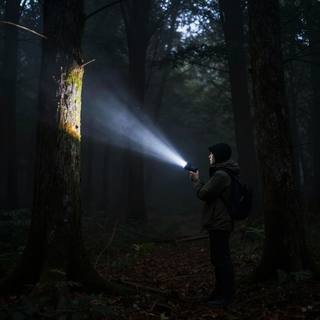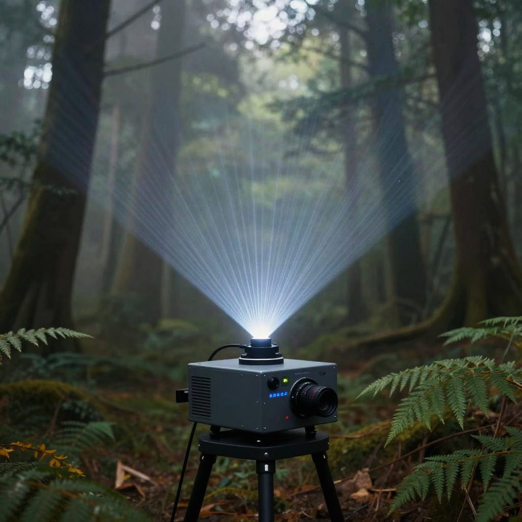 Artistic scene featuring a perspective generator device projecting infinite depth lines into a misty forest, ethereal light beams interacting with the environment, mystical atmosphere blending nature and technology, detailed textures and soft shadows