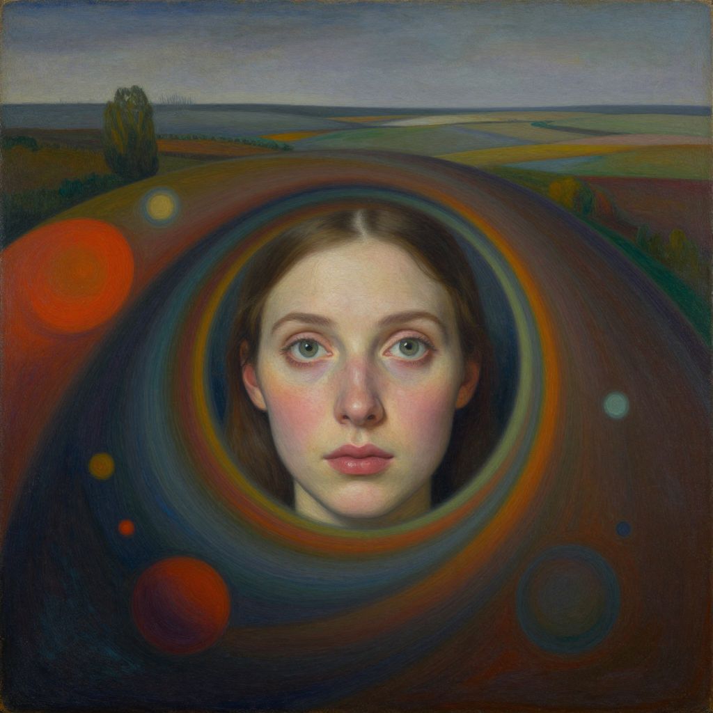 Digital artwork of a young woman with fair skin, light green eyes, and reddish-brown hair pulled back. She has a serene, slightly solemn expression with pinkish lips. A glowing, intricate golden halo surrounds her head, radiating light. She is set against a dark, desolate landscape with jagged rock formations and distant, shadowy structures. The background has a textured, almost sci-fi appearance. The overall style blends realism with a slightly ethereal, celestial influence. The woman appears to be the central focus, with the dark, ominous landscape contrasting her luminous halo.
