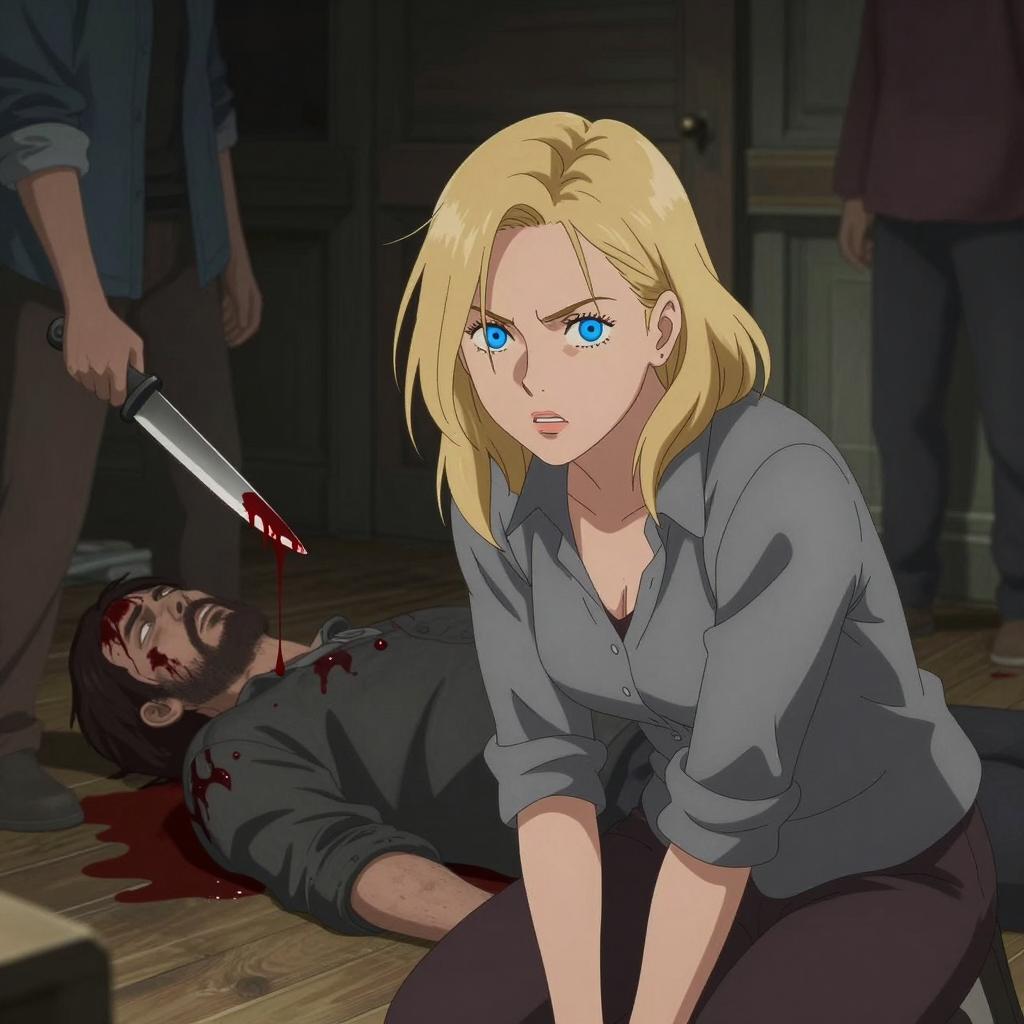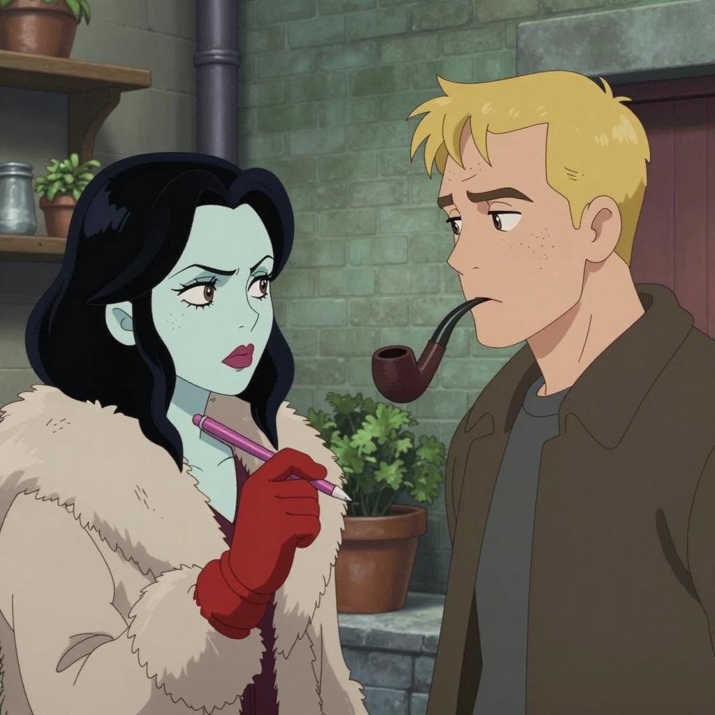 Cartoon drawing of two people in an alley. A pale-skinned woman with black and white hair, red gloves, and a fur coat holds a pink pen, staring at a light-skinned man with blonde hair, spots on his face, and a pipe. Background includes a green brick wall and potted plant. Woman's expression is intense. Man's expression is neutral. Alley setting with shelves and plants.