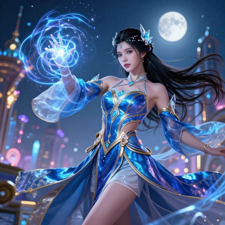 A digital artwork depicts a beautiful, fair-skinned woman with long, flowing black hair adorned with a blue, butterfly-like headpiece. She is dressed in an elaborate, blue and gold, fantasy-style dress with translucent sleeves and a low-cut bodice, exposing her shoulders and midriff. She casts a glowing blue magical orb with her right hand, which is encircled by a swirling, ethereal light. The background is a nighttime cityscape with blurred, colorful lights and a bright full moon. The overall style is vibrant and fantastical, with a focus on magical elements and a futuristic, cyberpunk aesthetic.
