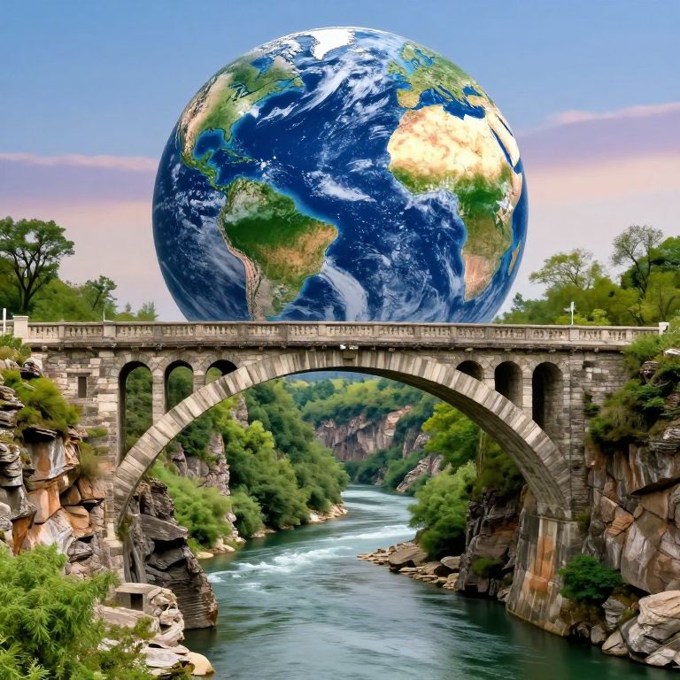 Spectacular archway of a stone bridge spans a serene river canyon, connecting a lush landscape below to a surreal backdrop where a massive, detailed globe of Earth looms above, its continents vividly highlighted against a tranquil sky.