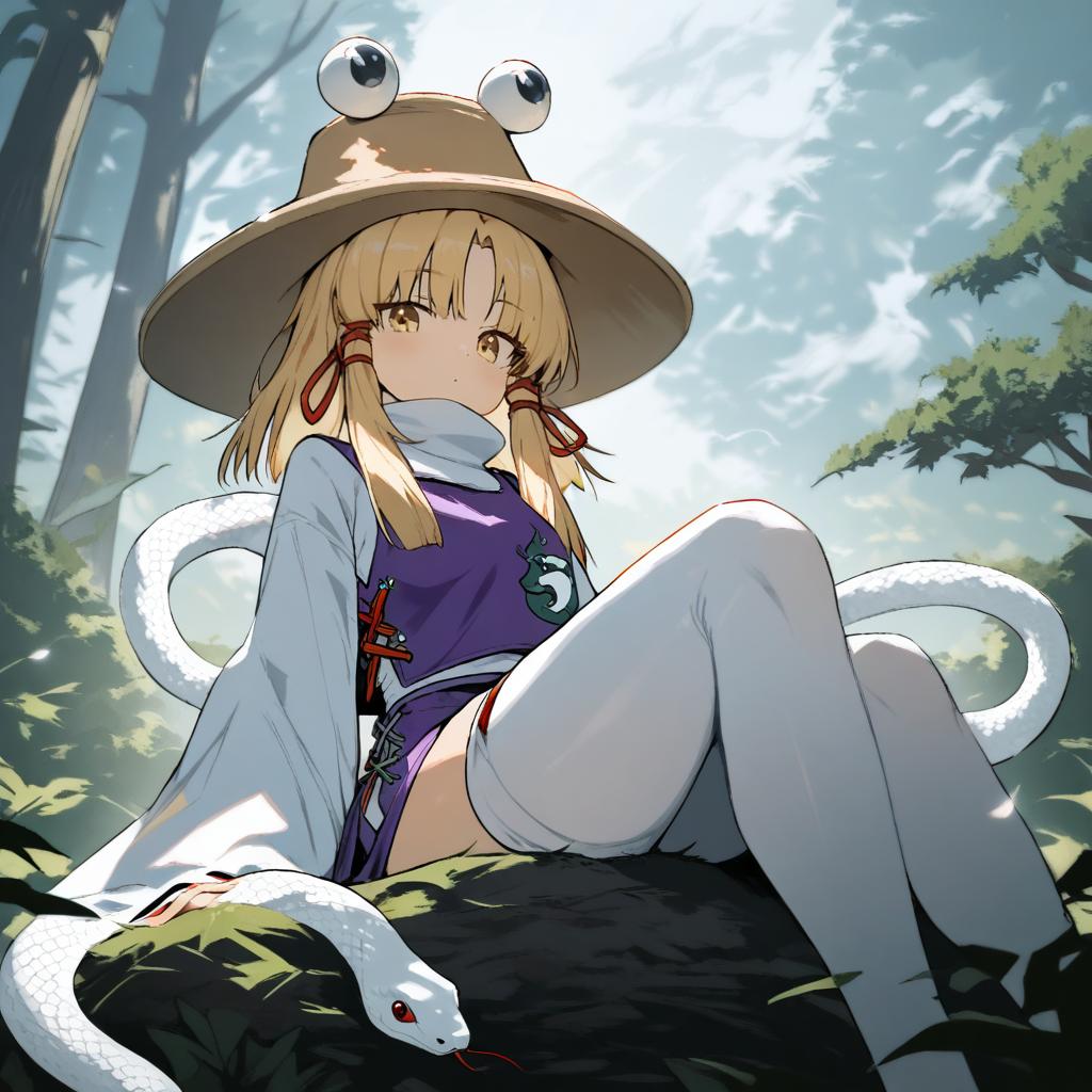 Moriya_suwako, 1girl, frog, blonde hair, animal print, yellow eyes, squatting, rain, frog print, hat, solo, ribbon, hair ribbon, tress ribbon, red ribbon, skirt, long hair, purple skirt, vest, thighhighs, brown headwear