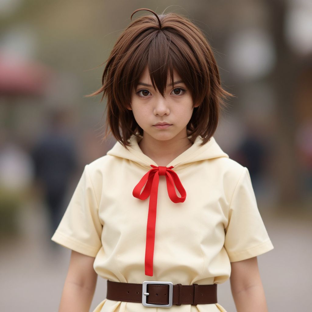 Photograph of a young Japanese girl with short brown hair, wearing a cream dress with a red ribbon and brown belt, standing in a blurry outdoor street