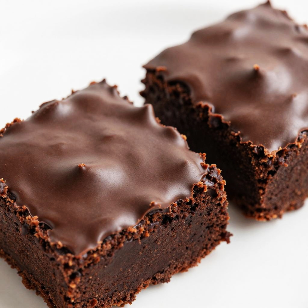 This close-up photo shows two rich, chocolate brownies topped with a glossy, thick layer of chocolate glaze. The brownies have a crumbly, textured surface with dark brown, moist-looking crumbs. The glaze is shiny and slightly uneven, with a deep, reddish-brown hue. The background is a plain white, making the brownies and glaze the focal point. The image has a warm, inviting feel.