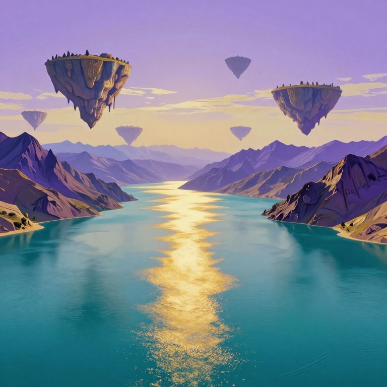 A surrealistic vista, reminiscent of Dali-esque dreamscapes yet infused with a futuristic flair, depicts a tranquil lake reflecting an ethereal sky filled with levitating islands and majestic mountains. The landscape is painted in vibrant shades of lavender, turquoise, and gold, capturing both tranquility and wonder as the aerial view above the shimmering water draws the viewer into this enigmatic world. This dreamlike tableau evokes contemplation on the mysteries of time and space, its bold colors and imaginative elements inviting audiences to ponder the nature of reality from a unique vantage point.