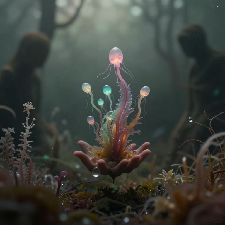 Photograph of a glowing, underwater alien-like plant with colorful jellyfish-like orbs and tentacles, surrounded by dark, misty forest background.