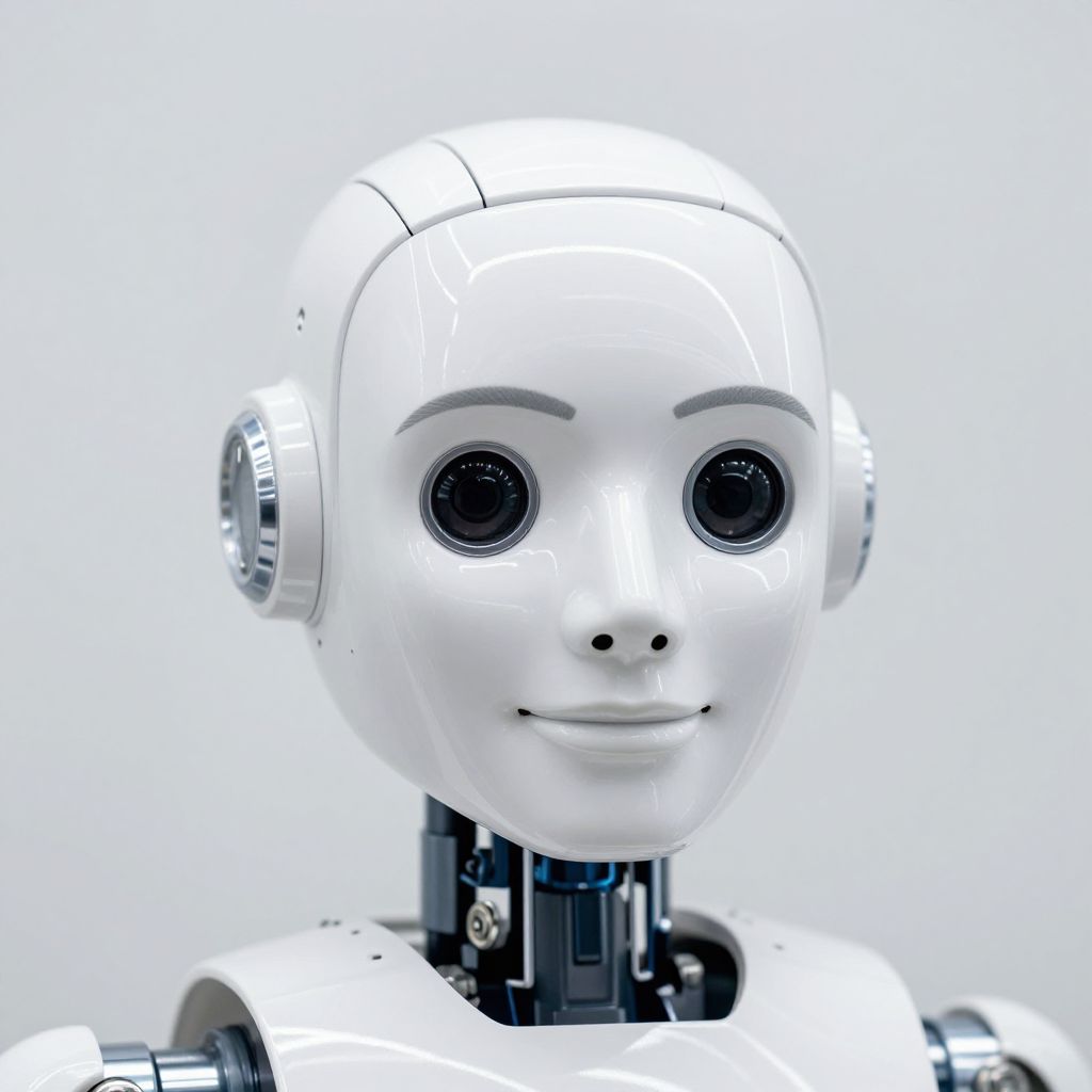 Photograph of a shiny white robot head with large black eyes, smooth white face, and a slight smile, set against a plain white background.