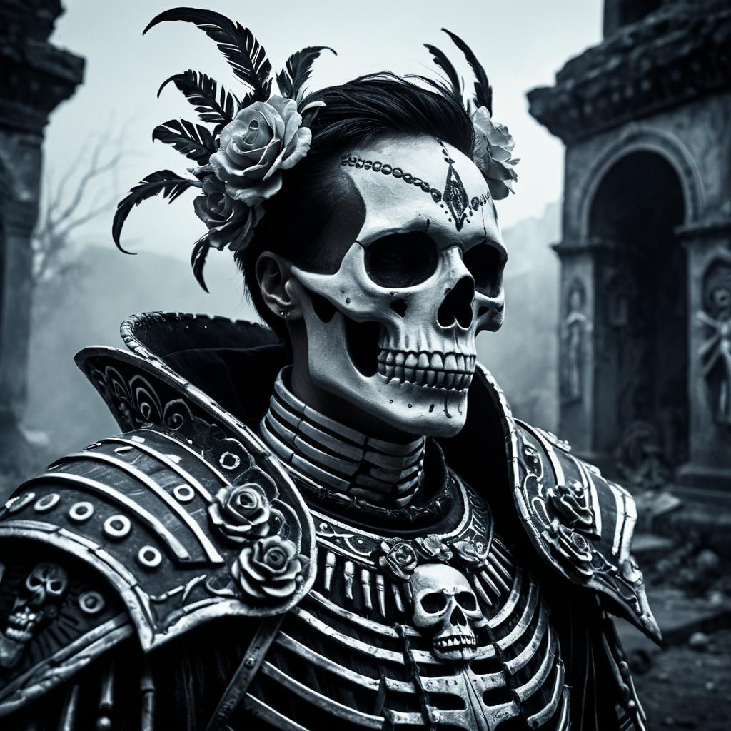 Male banshee in intricate skeletal armor, photo realistic, ultra detailed portrait, wispy skull face, la Catrina dia de los muertos, volumetric fog, Hyperrealism, breathtaking, ultra realistic, cinematic lighting, bleeding ruins