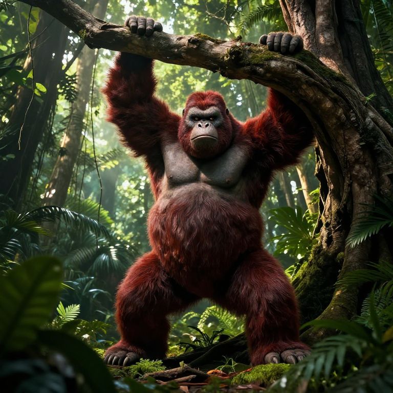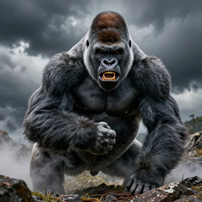 Digital artwork of a towering, red-furred gorilla with raised fists standing on a rocky cliff under a cloudy sky.