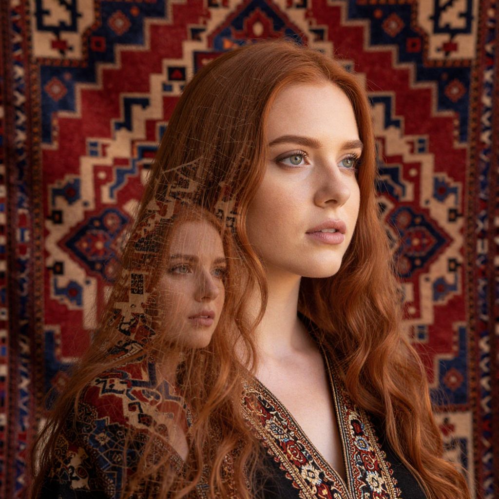 Craft a captivating double exposure portrait of a young woman with cascading red hair and intense green eyes; her features subtly obscured by intricate Persian rug patterns. The vibrant carpet colors seamlessly blend with her natural skin tones, hinting at a rich cultural backdrop. This evocative image captures the essence of tradition meeting modernity as she stands confidently yet serenely, her gaze fixed on an unseen horizon. Warm golden light bathes the scene, highlighting the soft textures of the rug and her resilient clothing, creating a mesmerizing fusion of two worlds in one harmonious portrait.