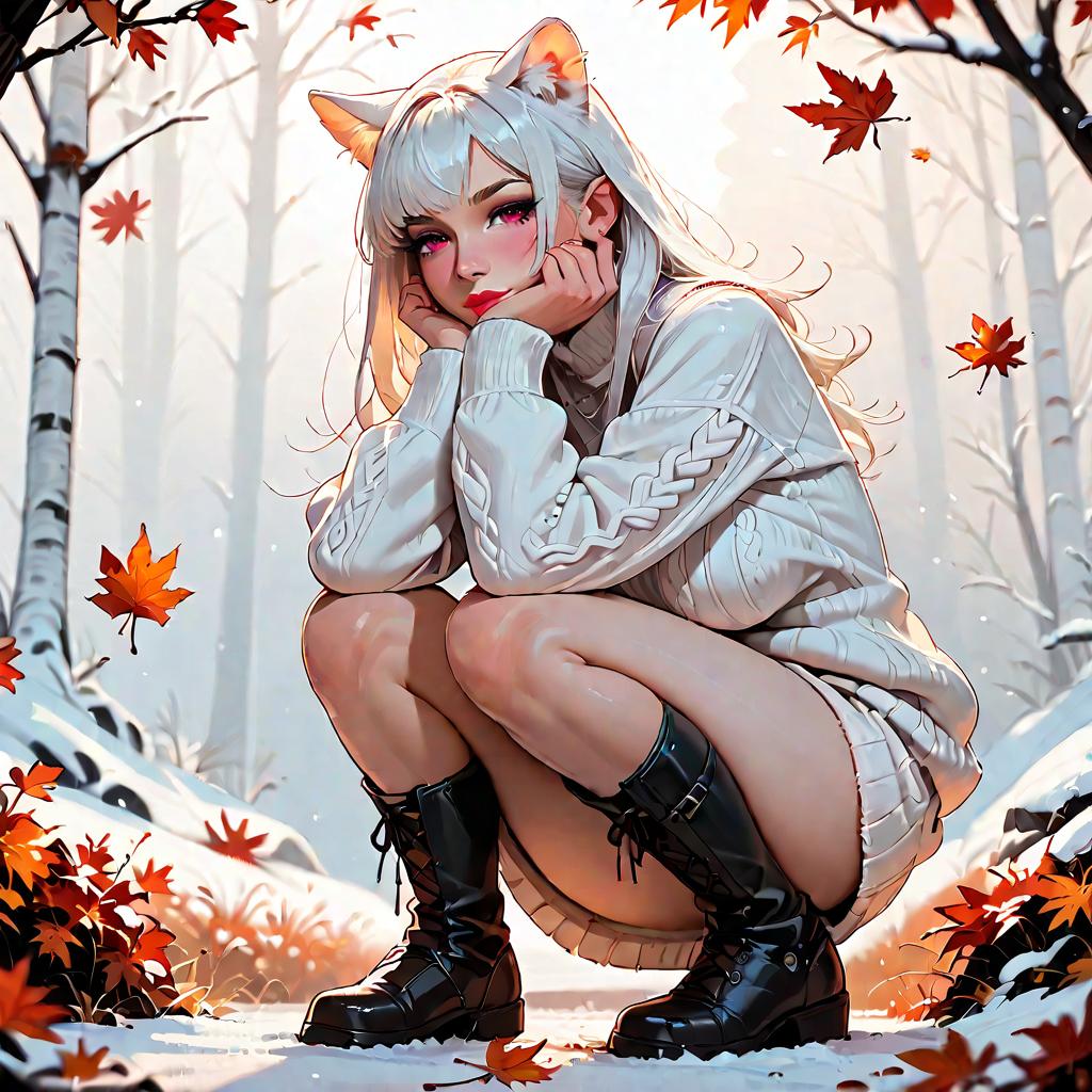 Score_9, score_8_up, score_7_up, source_furry, , Arctic cat girl with long snow-white hair, shaggy, squatting on the grass, big breasts, wearing sweater, ruffles, knee boots, looking at the sun, sunshine, autumn leaves, warm tones, detailed background photo, photo