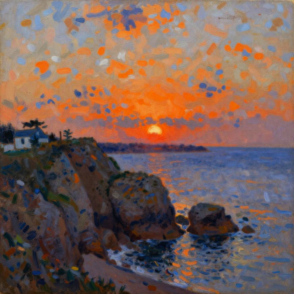 Impressionist painting on canvas, sunset in the rugged coastline of Brittany, in the style of Eugène Boudin, rich orange and indigo tones, delicate brushstrokes.