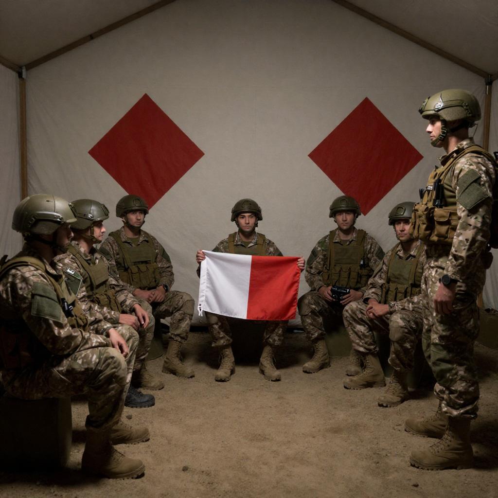 Photograph of a dimly lit tent with two large red diamond shapes on the back wall. Seven people in military-style uniforms with helmets and camouflage gear sit and stand in a semi-circle. One person in the center holds a white and red flag, while another seated person has a radio. The floor is sandy. The standing person on the right looks towards the center. The seated person on the left has a prominent white symbol on their jacket.