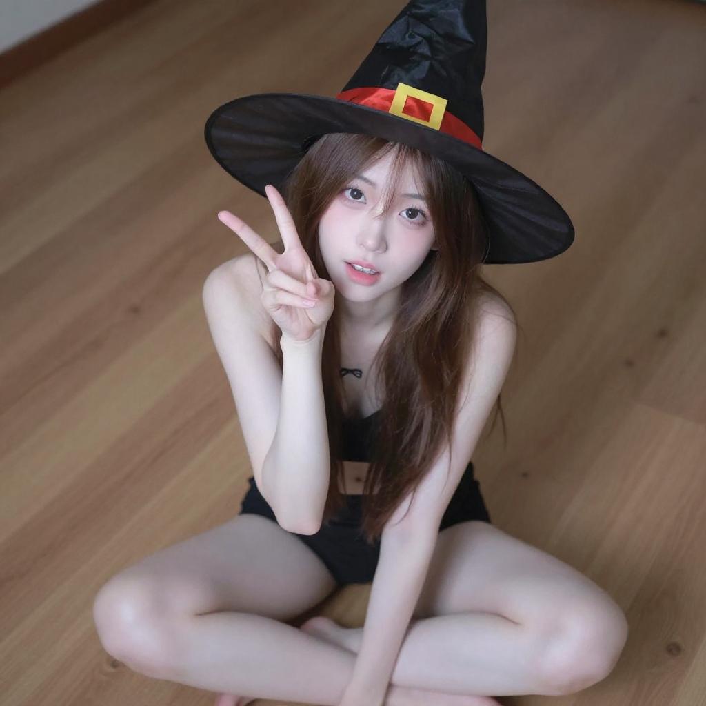 Photograph of an Asian woman with pale skin and dark brown hair, wearing a large black witch hat with red and yellow patterns, holding a gray tabby cat. She is nude, with small breasts, and the cat looks up at her with wide eyes. They are seated on a white surface with a black object in the background.