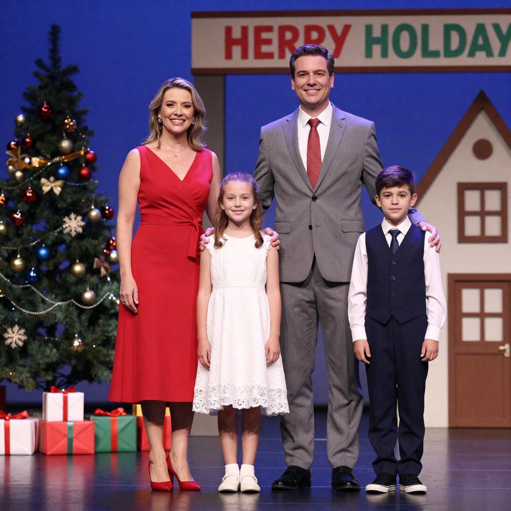 Photograph of three people on stage with a Christmas tree background. A Black man in a black suit with a red shirt holds a microphone, smiling. A white-furred puppet with pink ears and a red dress stands on a golden stool. A blonde girl in a gold dress stands between them, smiling. A woman with long black hair, wearing a red coat with white trim, holds a microphone and smiles. Gift boxes and fairy lights are in the background.