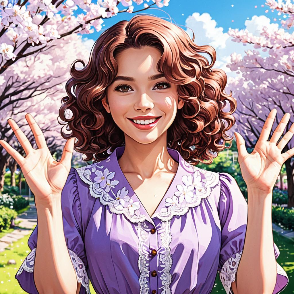 A cheerful anime style illustration of a cheerful student with bouncy golden bob, detailed clean line art, sky-blue eyes, wearing a striped tank top with open jacket, hand extended outward in a friendly gesture. The illustration features vivid and vibrant colors with soft shading, a serene forest edge with morning sunlight, and a bright and uplifting mood. High detail on facial expression and hair, with a dynamic yet harmonious composition.