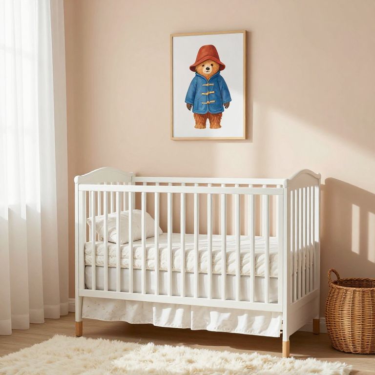 Cozy nursery featuring a white crib with layered bedding, positioned beneath a framed illustration of Paddington Bear, complemented by soft pastel walls, natural light streaming through sheer curtains, and a wicker basket and fluffy rug adding texture to the space.