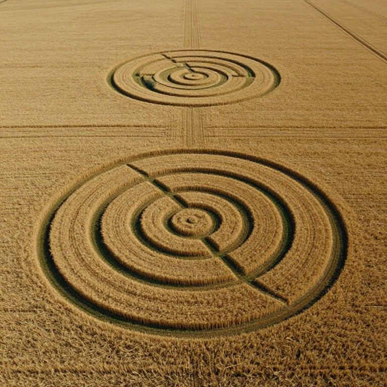 Aerial view of two intricate crop circles in a wheat field, featuring concentric circles and a central design, captured in a photorealistic, cinematic style with hyper detail.