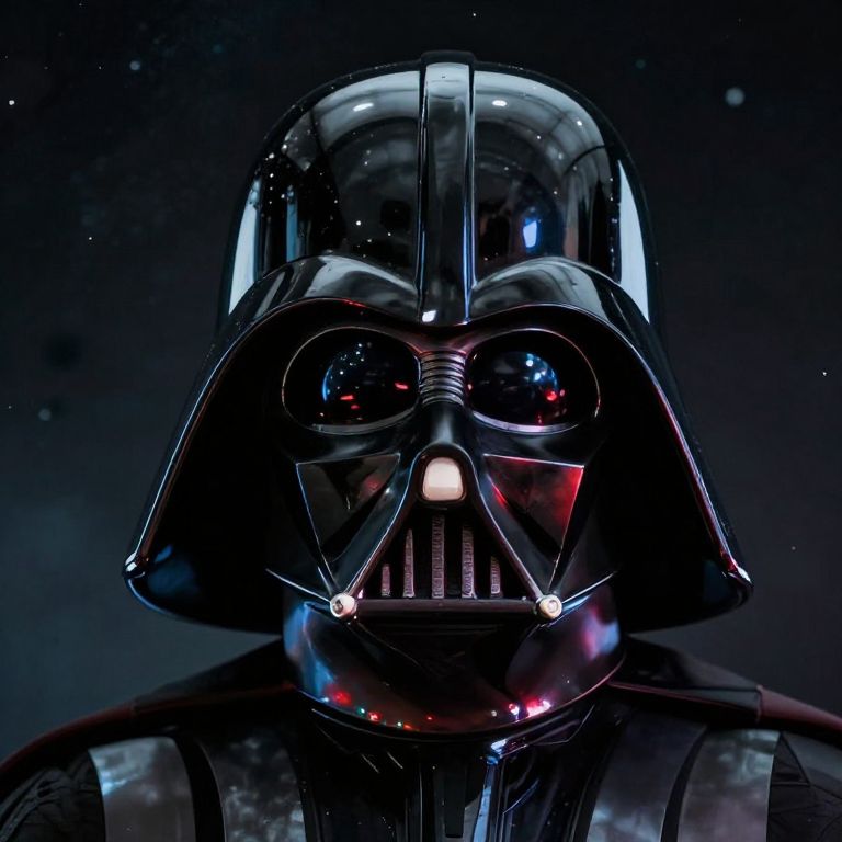Darth Vader close up, highly detailed portrait of a futuristic black helmet glowing faintly with red and blue reflections, a dark starry space background with subtle hints of metallic texture, cinematic lighting emphasizing the menacing mask