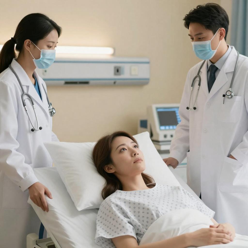 Two medical professionals, a woman in white surgical attire and a man in blue scrubs, are performing surgery on a male patient lying on an operating table. Both are wearing surgical masks and gloves, working carefully with medical instruments. The patient’s chest is exposed and draped with a green surgical cloth. Medical monitoring equipment is visible in the background, highlighting a clinical hospital environment.