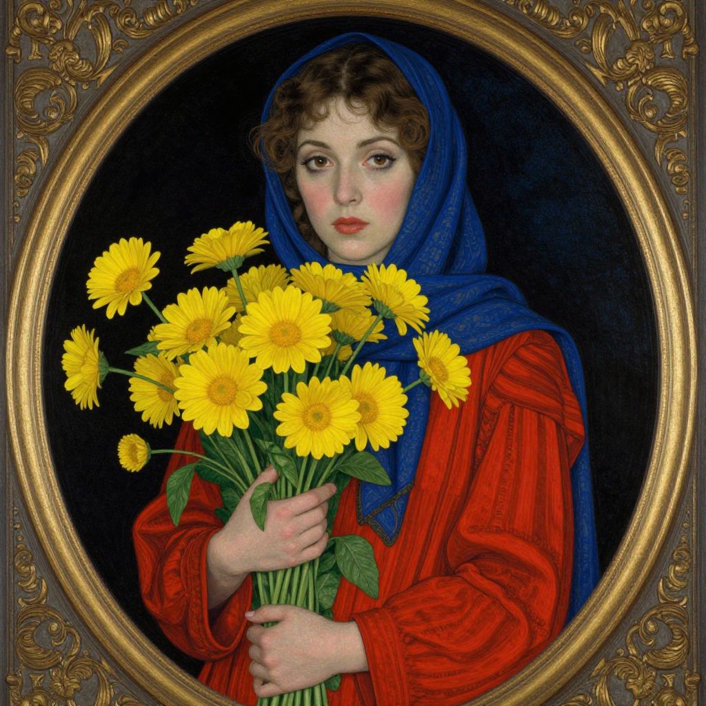 This digital painting depicts a young woman with fair skin and dark, wavy brown hair, wearing a vibrant red dress and a blue headscarf. She holds a bouquet of bright yellow daisies close to her chest with both hands. Her makeup includes bold red lipstick and dark eye makeup, giving her an elegant appearance. She stands against a black background, framed by an ornate, gold circular frame with intricate floral patterns. The contrast between the bright flowers, her red dress, and blue headscarf, and the dark background emphasizes her figure and the vivid colors of the flowers and clothing.