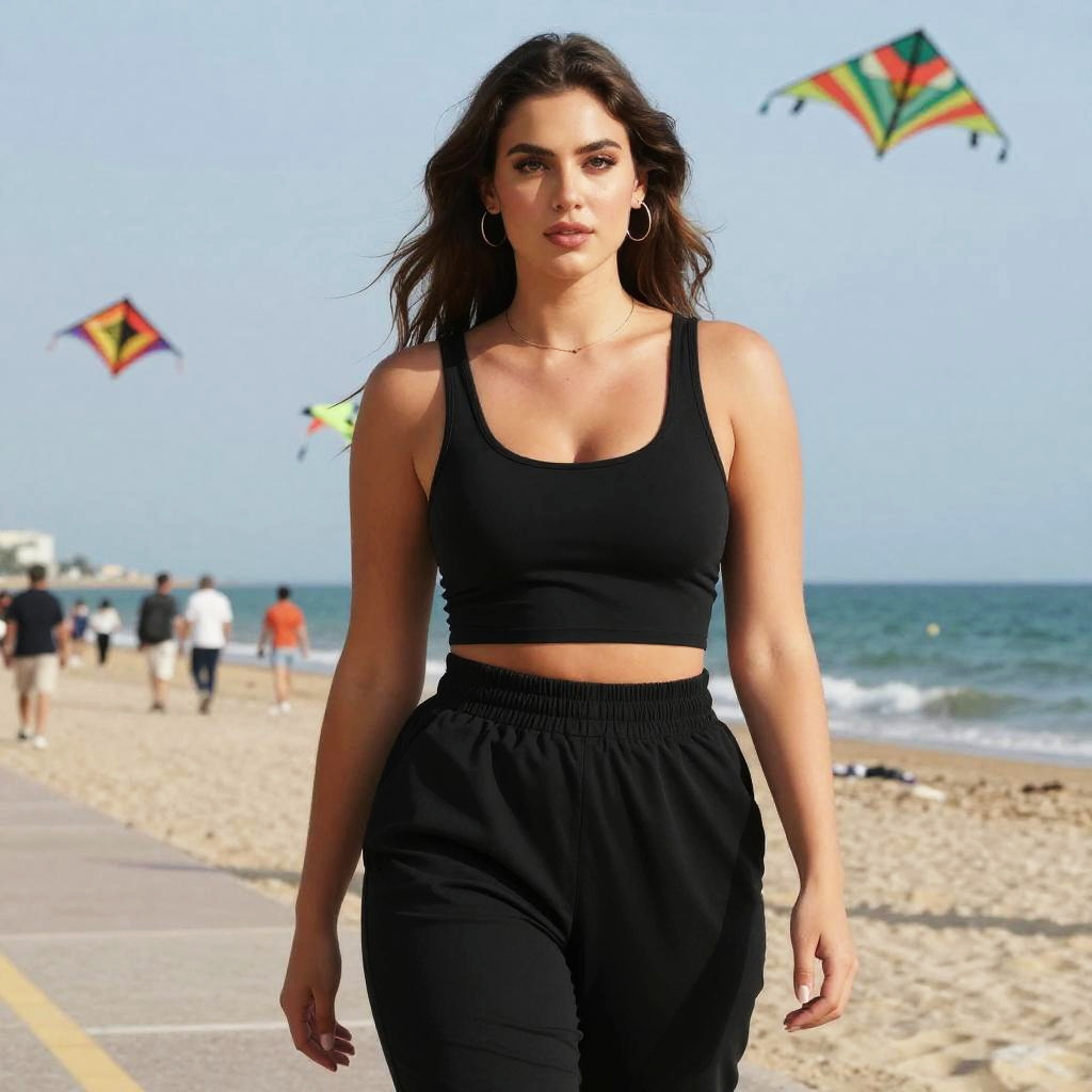 Photograph of a confident woman with long dark hair, wearing a black halter top and high-waisted black leggings, standing on a sunny beach