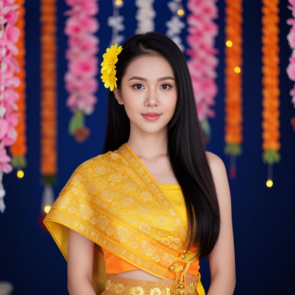 Portrait of a young Asian woman wearing a vibrant yellow and orange traditional Thai dress with floral patterns. She has long, straight black hair adorned with a yellow flower. The background is dark blue and decorated with hanging flower garlands featuring pink and orange blooms and small yellow lights.