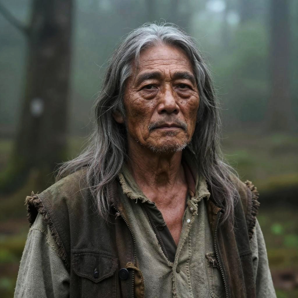 60 year old man with long hair standing in a misty forest, weathered face, deep eyes, dressed in rustic clothing, serene expression, soft natural lighting, detailed textures