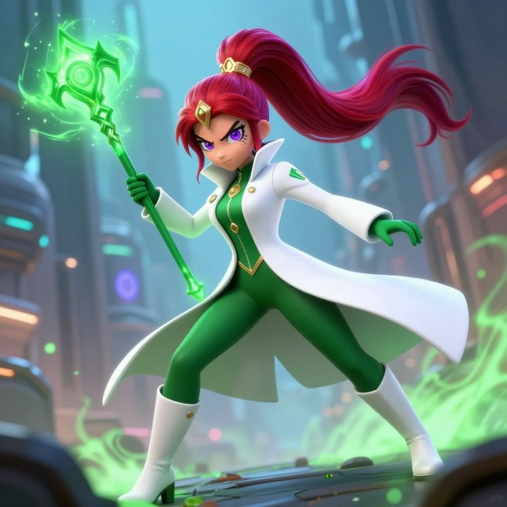 (best quality, masterpiece, absurdres, highres, ultra_detailed, dynamic angle:1.2), 1girl, long white coat, ponytail, very long red-purple hair, gold crest, green bodysuit, green gloves, dark green tight pants, white tall boots, tattoo around eyes, purple eyes, wielding a green orbstaff, glowing eyes, casting spell, green magic, solo, futuristic city, cartoon, cartoon style, (intricate details, hyperdetailed:1.15), (ultrahigh resolution textures), bokeh, (volumetric, cinematic) lighting
