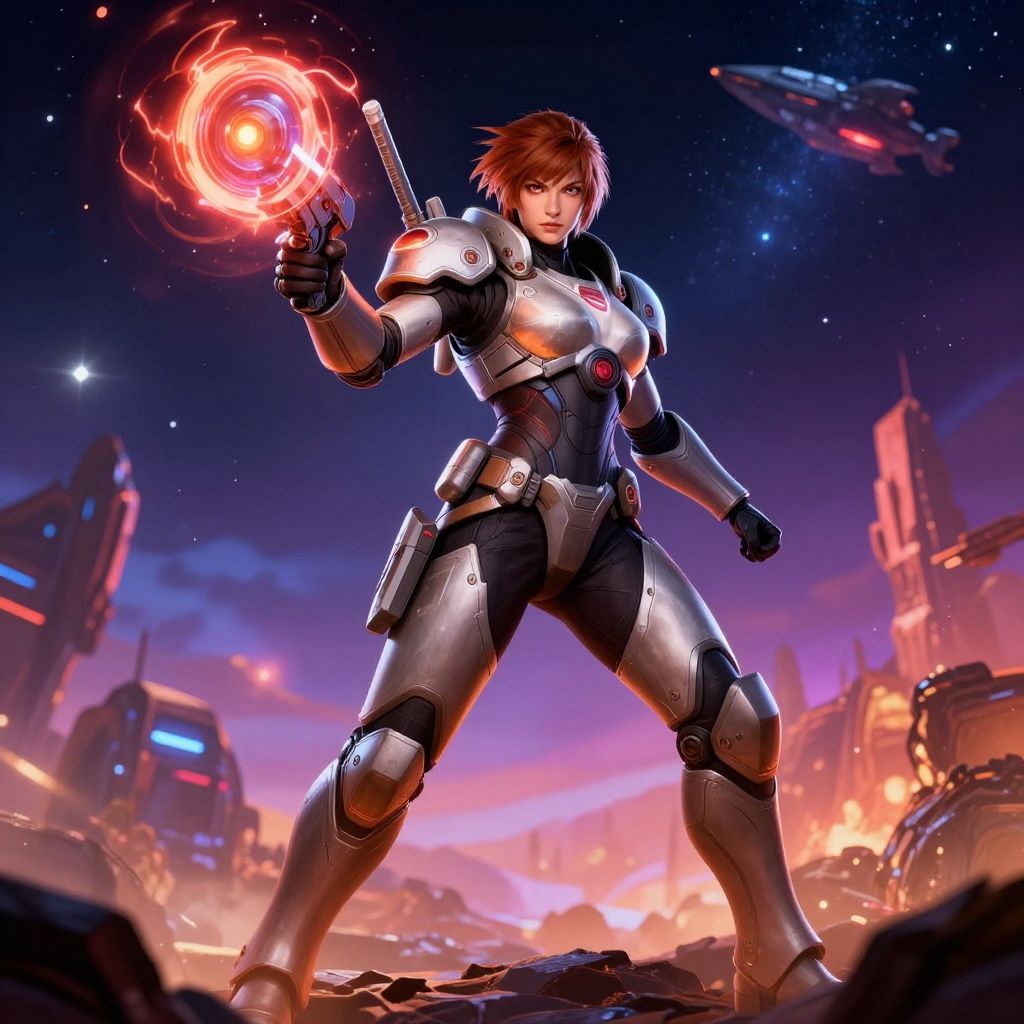 Female space marine art, fierce warrior in futuristic armor, glowing energy weapons, standing on alien battlefield with stars and spaceships in the background, vibrant colors, dynamic pose